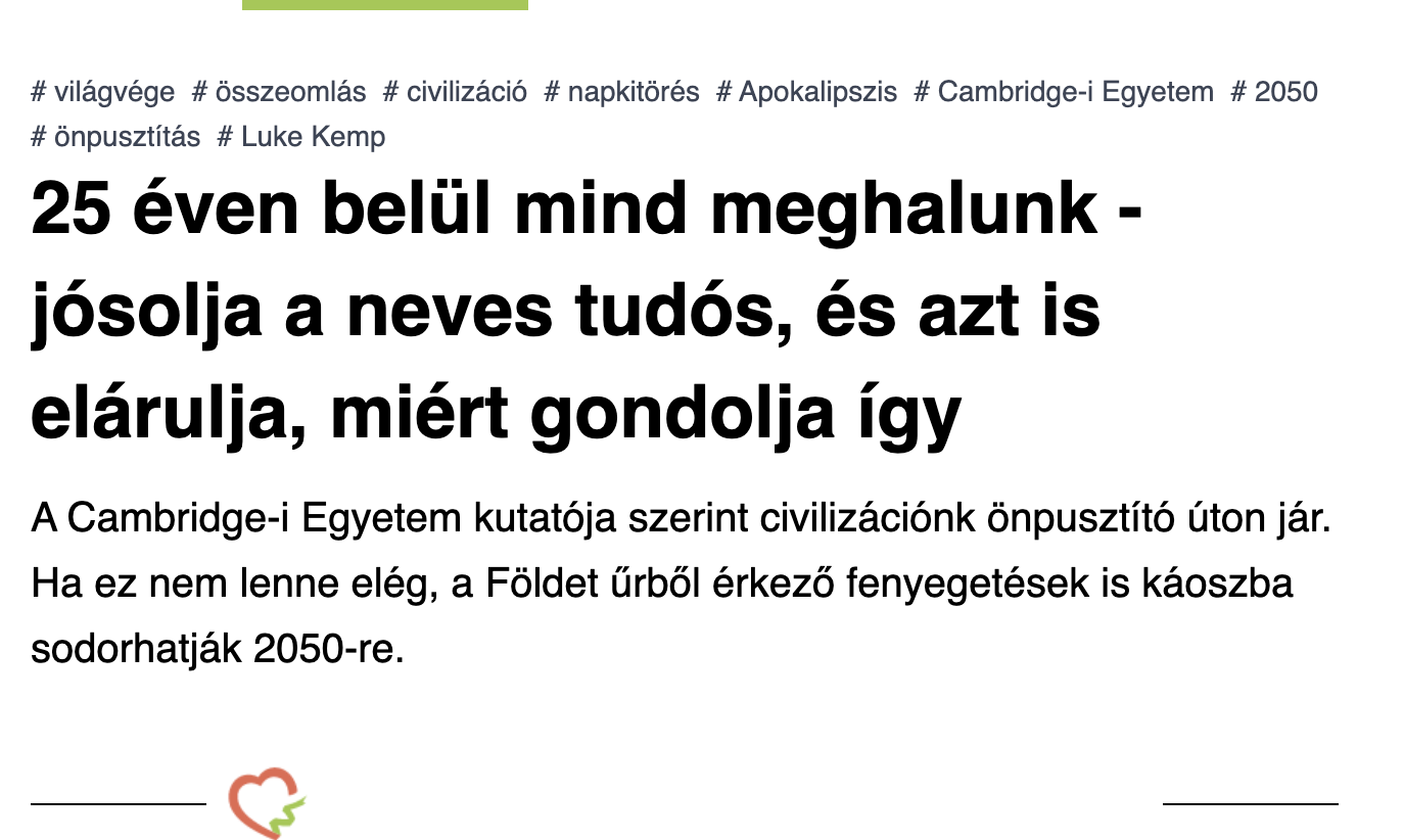 A Facebookon és különböző portálokon mégis olyan címekkel terjedtek a cikkek, mint például „2050-re mind meghalunk” vagy „Neves tudós szerint 25 évünk van hátra”. Ezek a megfogalmazások nemcsak félrevezetik az olvasót és (feleslegesen) keltik a pánikot, hanem elvonják a fókuszt az eredeti üzenetről, amely sokkal inkább a megelőzés fontosságáról szólt. A valóságban Kemp és más szakértők célja az volt, hogy tudományos adatokkal alátámasztva felhívják a figyelmet: a klímaváltozás, a geopolitikai feszültségek, valamint a technológiai kockázatok – például a mesterséges intelligencia ellenőrizetlen fejlődése – mind komoly veszélyeket hordozhatnak.