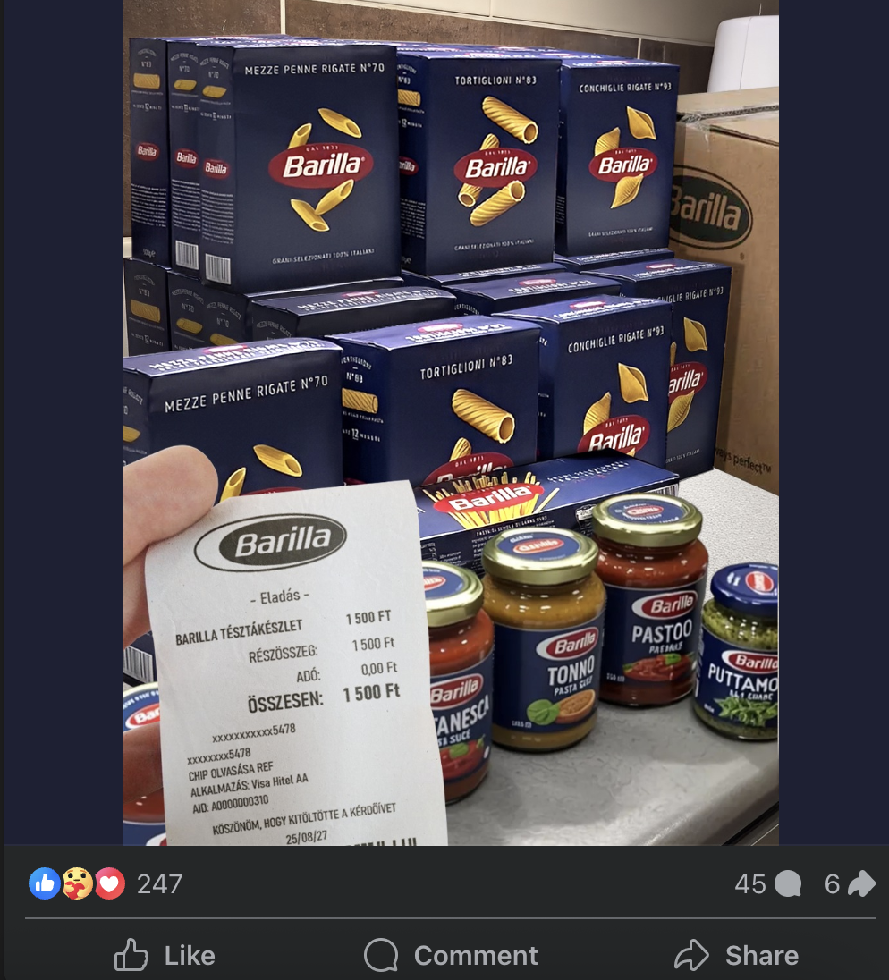 Az oldal egyik bejegyzése kétszer is megjelent egy napon belül: először hajnalban, majd néhány órával később újra. A szöveg szerint „egy tippet” adnak, amelyet a „posztoló lánya” osztott meg, aki állítólag a Barillánál dolgozik. A hamis poszt szerint egy rövid kérdőív kitöltésével bárki hozzájuthat egy hatalmas Barilla-ajándékcsomaghoz, tele tésztákkal és szószokkal. A bejegyzés nyelvezete azonban távol áll a természetes magyar használattól: erőltetett és fordítói hibákat is tartalmaz, ami arra utal, hogy egy idegen nyelvű szöveg gépi fordításáról van szó.