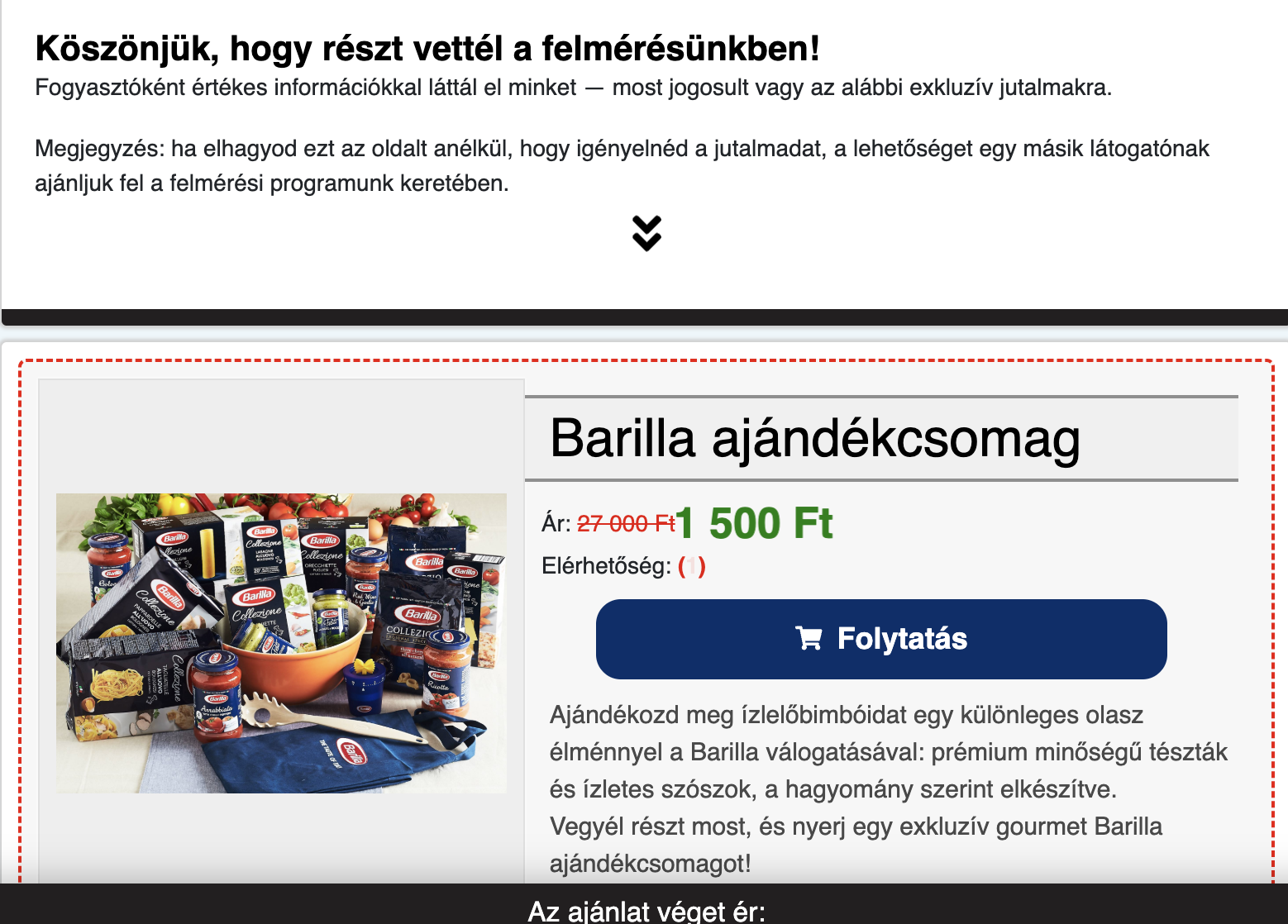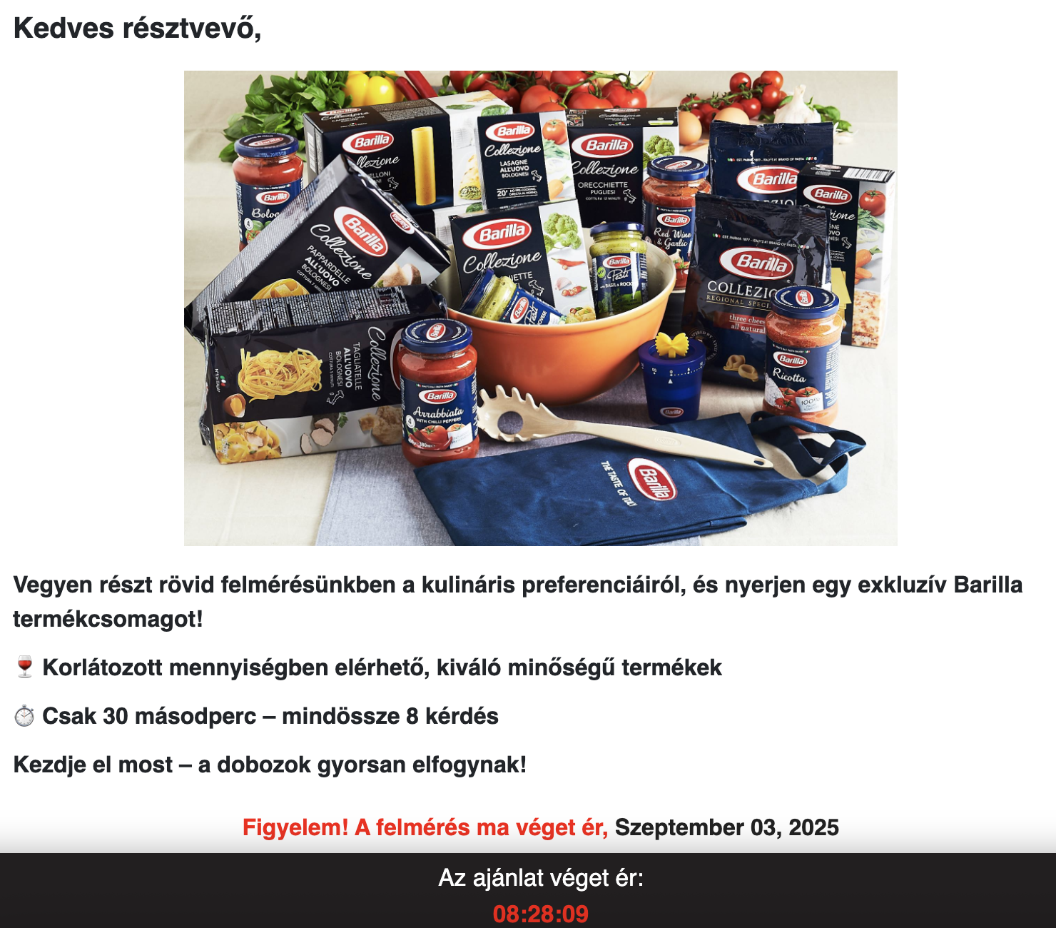 The page itself asks just eight simple questions about pasta and then simulates a “verification process.” Afterward, users are told that the gift box is “in stock” and available for only 1,500 HUF instead of its supposed 27,000 HUF value. The site stresses that there is “only one package left,” again pushing visitors to act quickly.