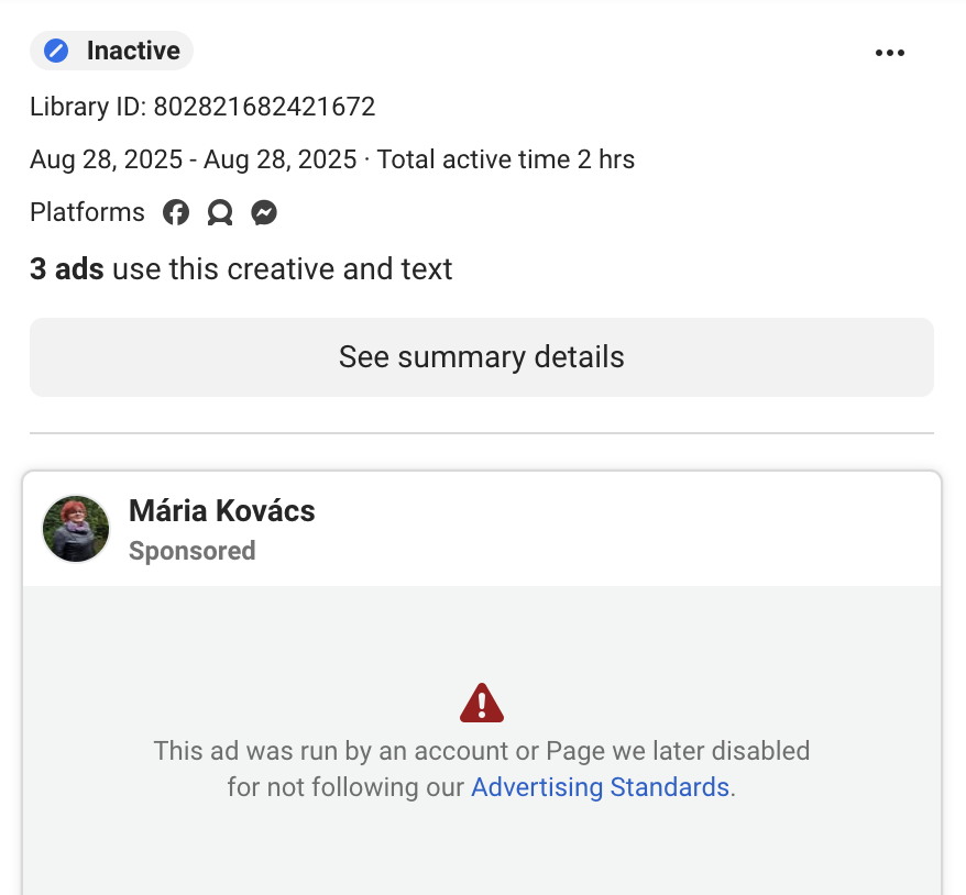Bár az oldalnak csupán három követője van, a két poszt összesen közel 600 reakciót és 70 hozzászólást gyűjtött – ezek azonban mind hamis profiloktól származnak. A Meta hirdetési rendszerében jól látszik, hogy a posztokat fizetett hirdetésként is futtatták, ám a hirdetések már inaktívak, mivel tiltották őket.