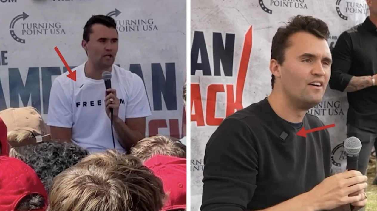 Egy másik, milliós megtekintést elérő videó egy „gyanús részletet” emelt ki a felvételről. A kommentelők egy fekete foltra lettek figyelmesek Kirk jobb mellkasánál és vállánál, amely a lövöldözés közben látszólag eltűnik. Sokan ebből arra következtettek, hogy az esemény megrendezett lehetett, vagy előre elhelyezett eszközről van szó. A valóságban azonban Kirk rendszeresen viselt egy mágneses mikrofoncsipeszt, vagy ahhoz hasonló készüléket ugyanazon a helyen. A fekete folt tehát nem rendellenesség, hanem megszokott része volt nyilvános szerepléseinek.