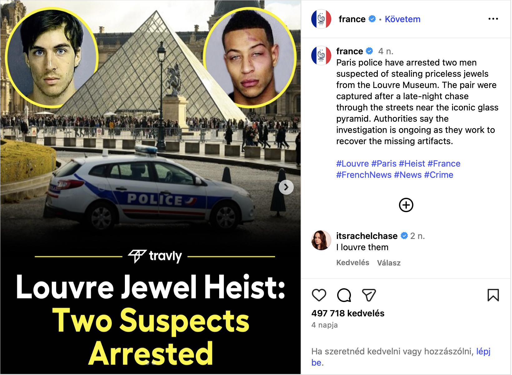 2025. október 19-én nappal, Párizsban a Louvre múzeum Apollo-galériájából nyolc kiállítási tárgyat, a francia uralkodói család gyémántokkal és smaragdokkal díszített ékszer-kollekcióját tulajdonították el a rablók, 88 millió EUR becsült értékben. A betörők egy felvonót használtak a múzeum falán történő feljutáshoz, majd motorral távoztak a helyszínről — mindez összesen hét perc alatt zajlott le. A nemzetközi közvélemény és a média azonnal vezető hírként számolt be az esetről. Közvetlenül az eset után a francia hatóságok megerősítették, hogy a nyomozás folyamatban van, de hivatalosan nem tettek közzé képeket vagy személyleírást a feltételezett elkövetőkről.